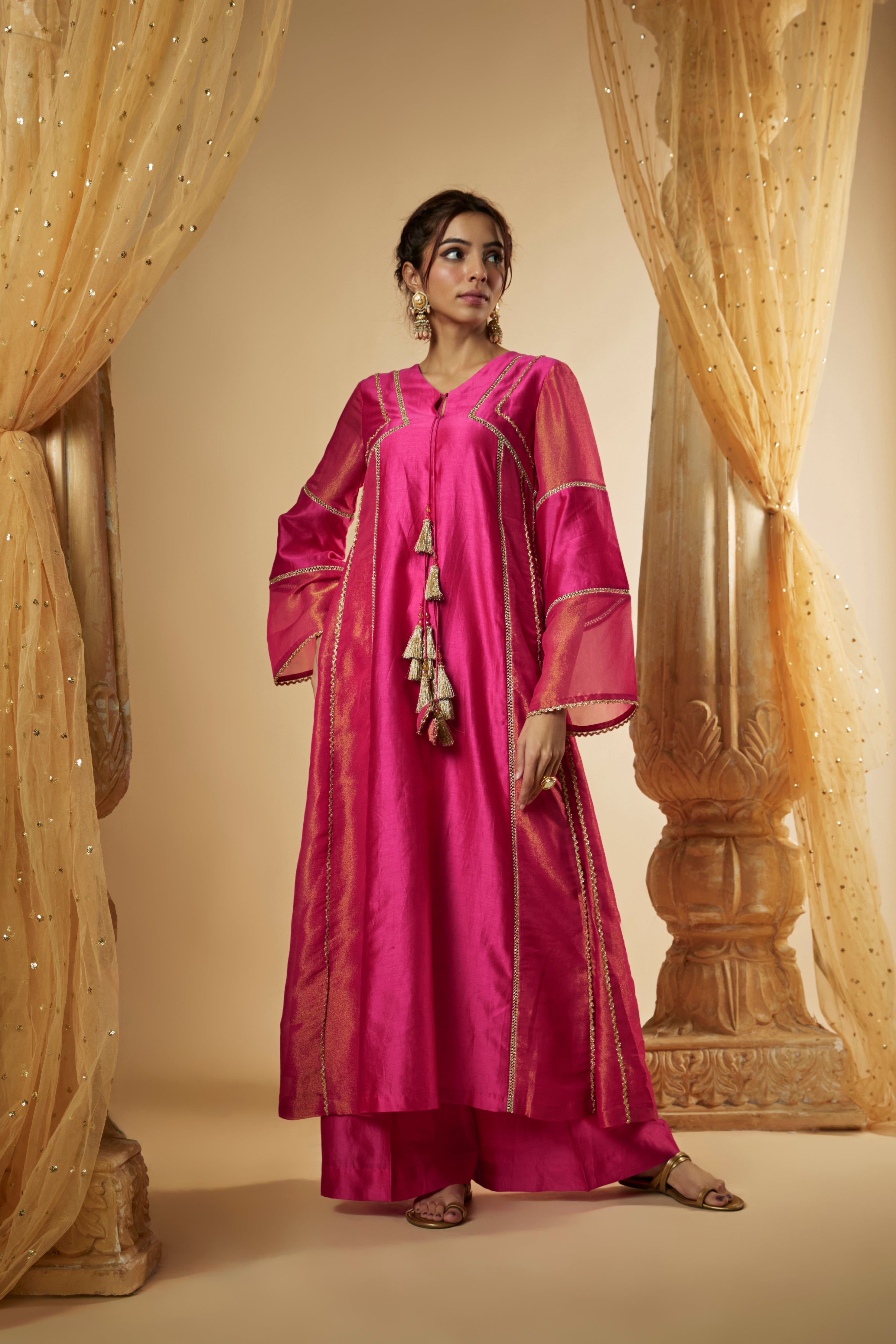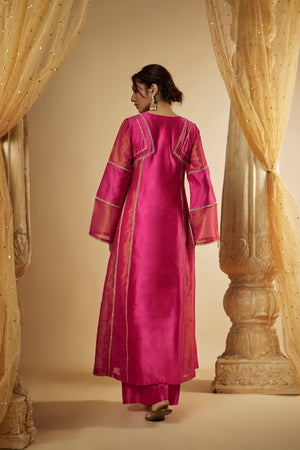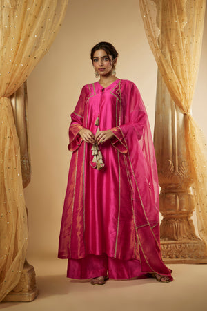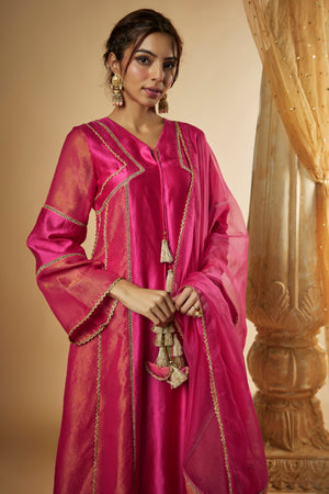 Featuring Our Pink Chanderi Silk ans zari organza Anarkali Set. It is enhanced with laces and panels further combined with tassle latkans. It is paired with matching palazzo pants and panelled dupatta.
