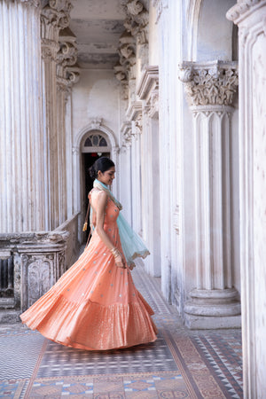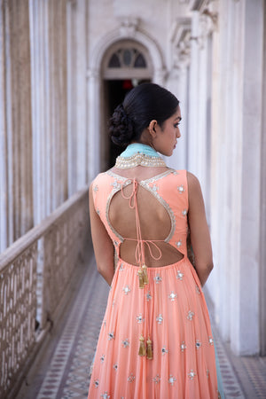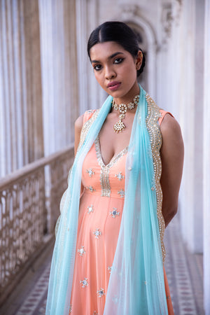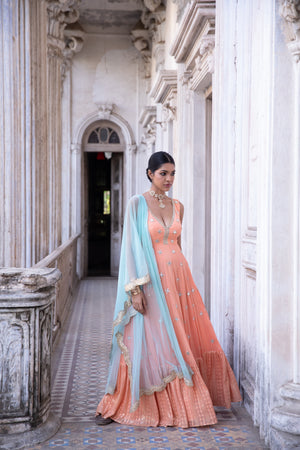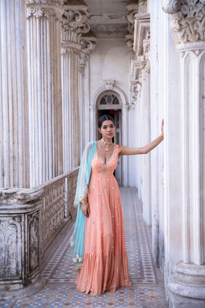 This Look Features A Tangerine Anarkali Gown Set. The V Neck, Sleeveless Anarkali Is Embellished With Gold Sequin And Mirror Embroider. It Further Descends Into A Thick Sequin & Thread Embroidered Border. A Contrast Mint Net Dupatta With A Scallop Border And Bootis Completes The Look. Cancan & Pockets Are Included.