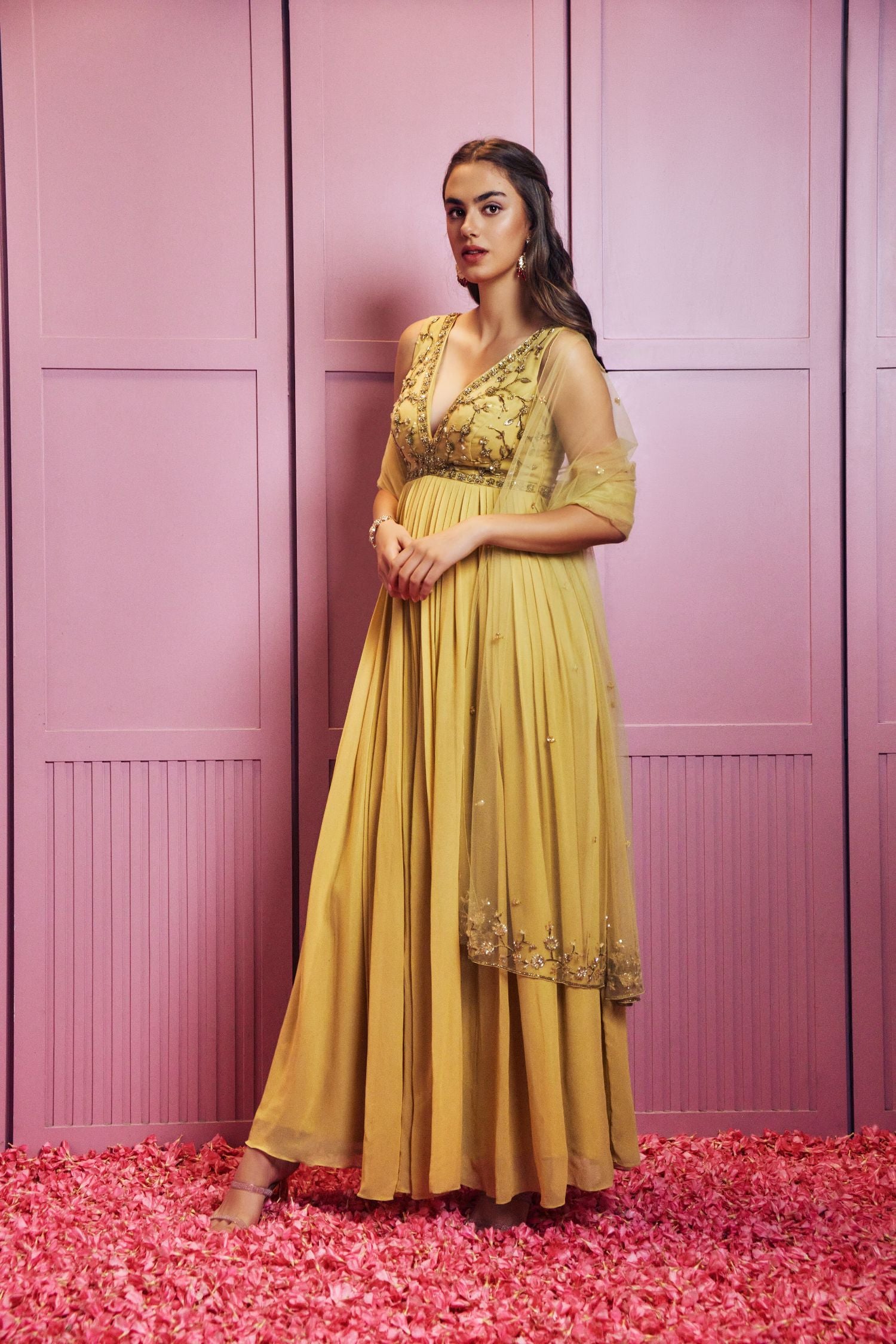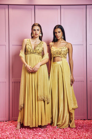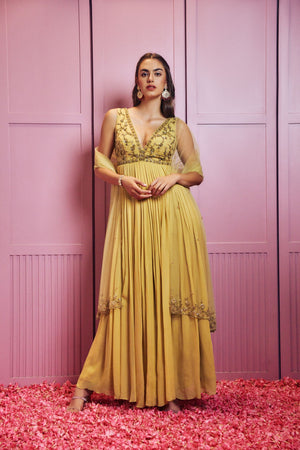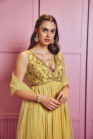 Lemon yellow crystals hand embellished Anarkali paired up with tulle dupatta
