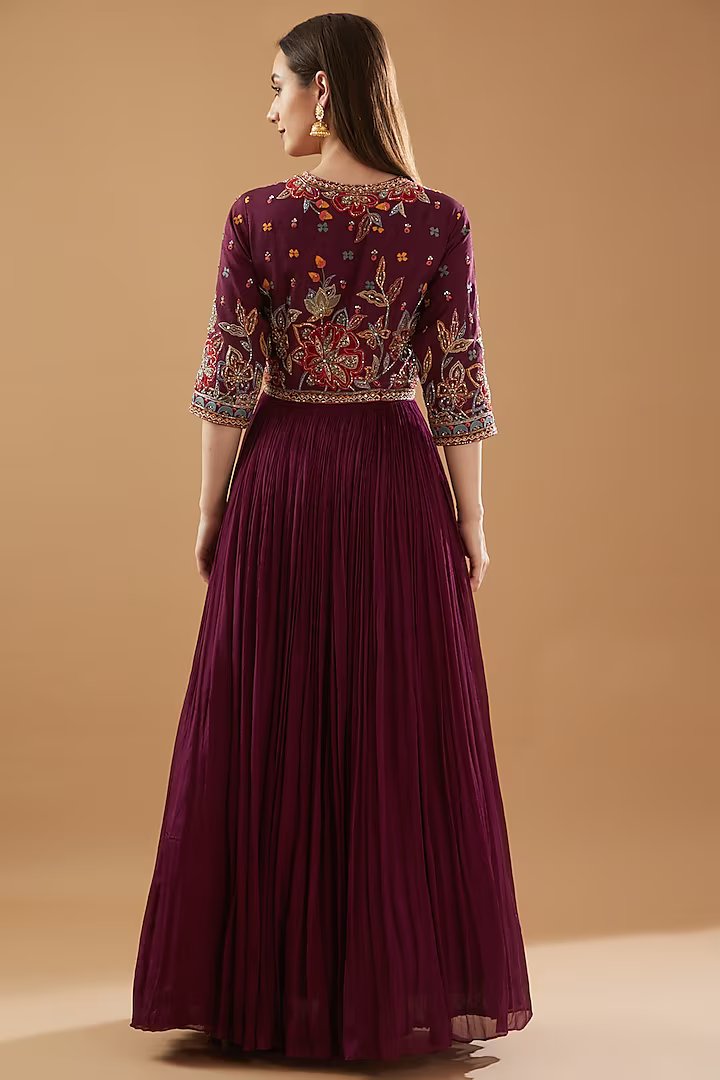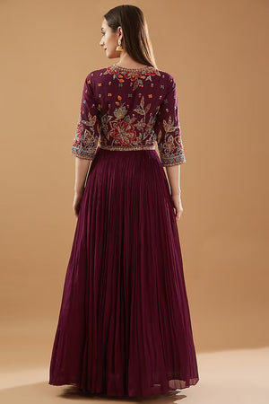 Wine Embroidered Ruched Anarkali, the set is Highlighted with Floral Embroidery Details & is Paired with Organza Dupatta.