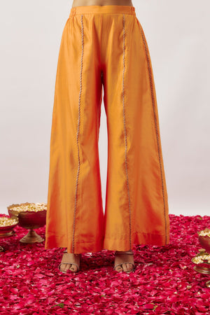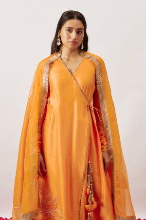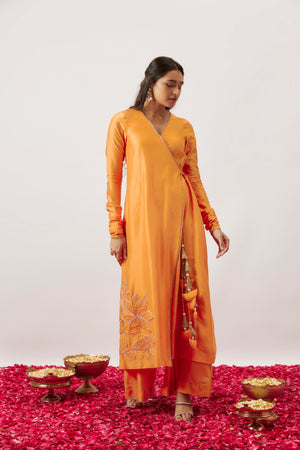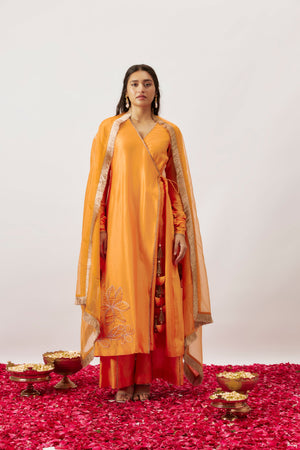 Introducing our timeless classic the orange Handwoven Chanderi Angharkha Set. The side panel is highlighted with intricate appliqué work and hand-embroidered zari dori, . Accented with delicate lace embellishments. Paired with palazzo pants and an organza dupatta.