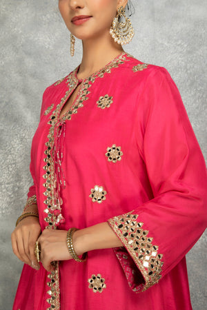 This exquisite Angrakha is crafted from soft cotton silk and features intricate mirror embroidery, beautifully complemented by detailed dori work on the front. It is paired with floral digital printed pants, enhanced by delicate button detailing, completed with a lightweight organza dupatta, adding an airy and elegant touch to the ensemble—perfect for festive occasions and celebrations.