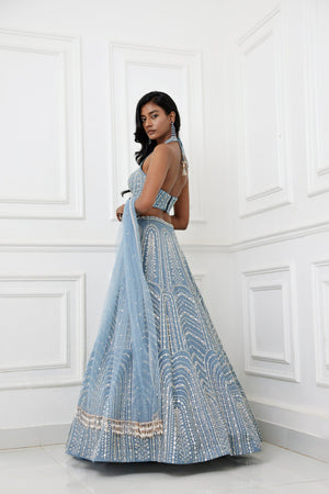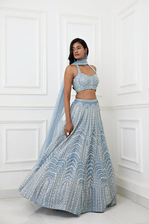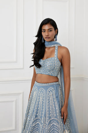 Grey Organza Embroidered Lehenga And Halter Neck Blouse With Glass Beads,Zardosi And Stone Embroidery Detailing , Paired With Glass Bead And Pearl Work Bordered Tulle Dupatta