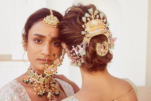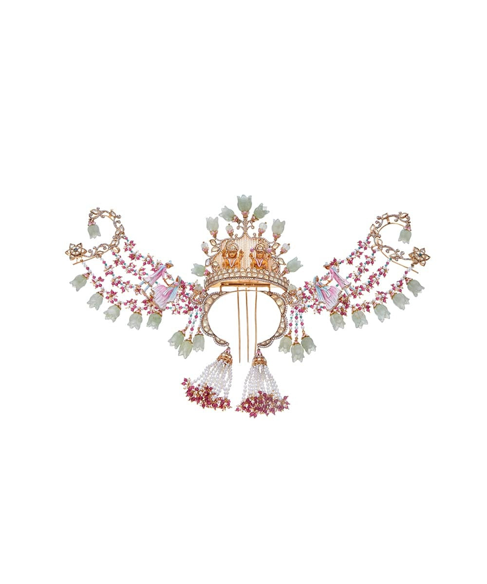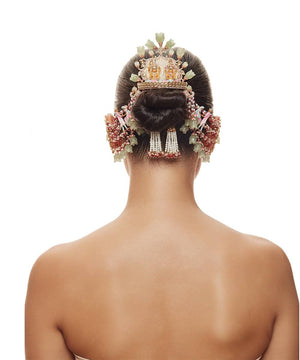 Anjani carved stone tulip bun accessory with meenakari God – Godess figures, pearl tassel details, and bride – groom ear chains connecting to earcuffs.