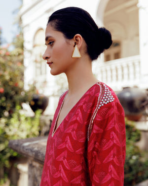 Maroon Leaf Print Shoulder Stiff V Neck Kurta Set