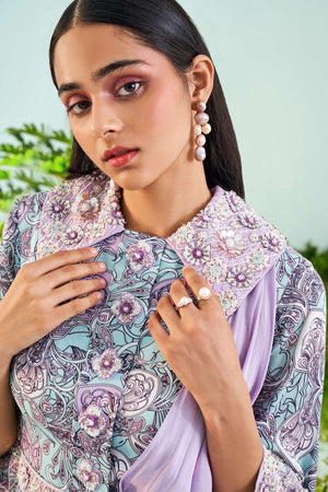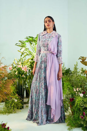 This jumpsuit includes embroidered collar , embroidered belt & separate drape.