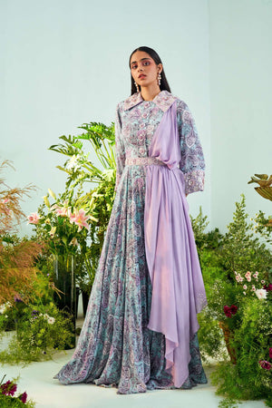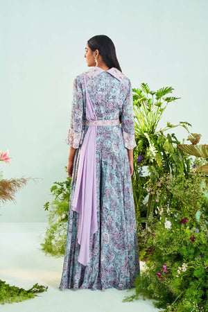 Paisley print jumpsuit with embroidered collar & drape