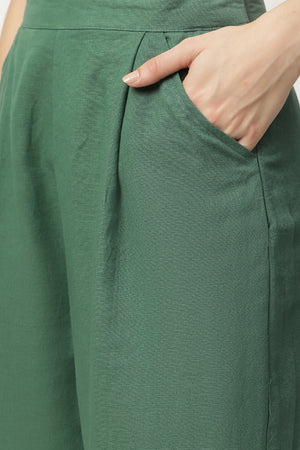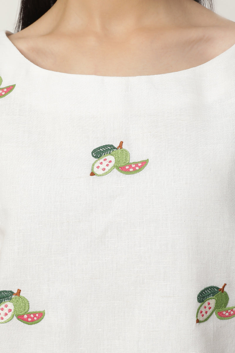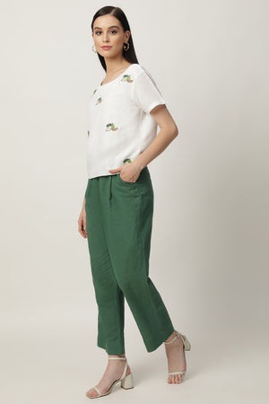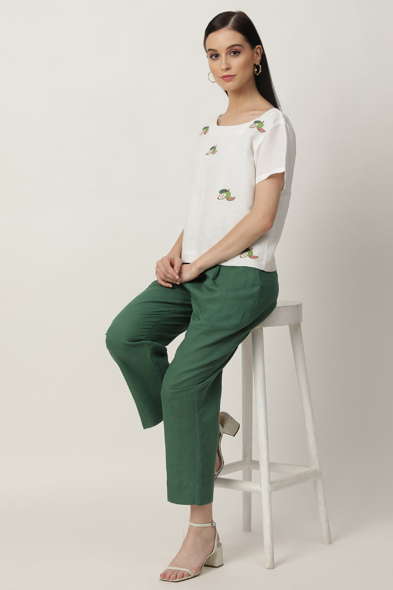 Ivory colour linen boat neck guava embroidered top with straight and loose linen pants in contrasting deep green colour