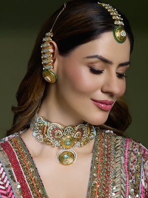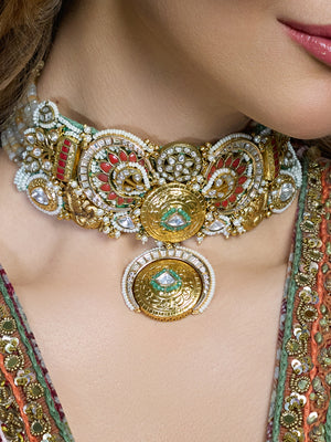 This amazing necklace radiates old-world elegance with its blend of circular and teardrop motifs in gold and silver tones. Ideal for pairing with silk saris or vintage bridal wear, this piece whispers tales of timeless beauty and ancestral grace. Add matching earrings & accessories to complete the look.
