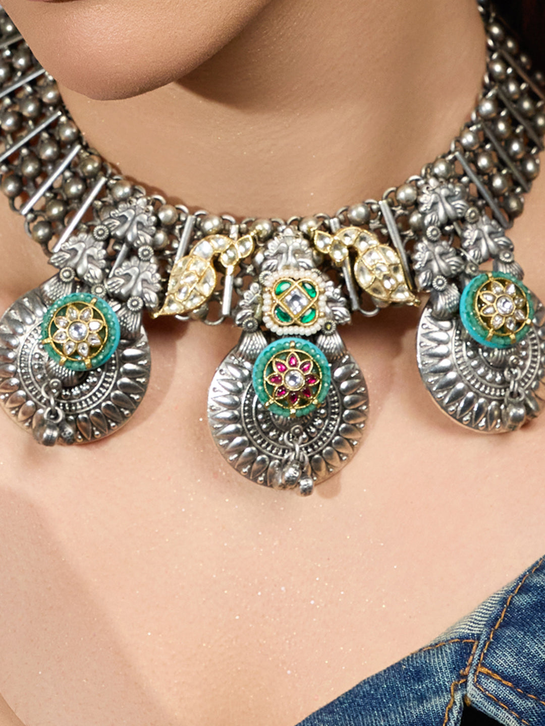 This Antique Coin Necklace features oxidized metalwork, intricate detailing, and hanging round motifs with hints of green and gold. A perfect fusion of heritage and artistry, it enhances ethnic wear with bold character and timeless beauty.