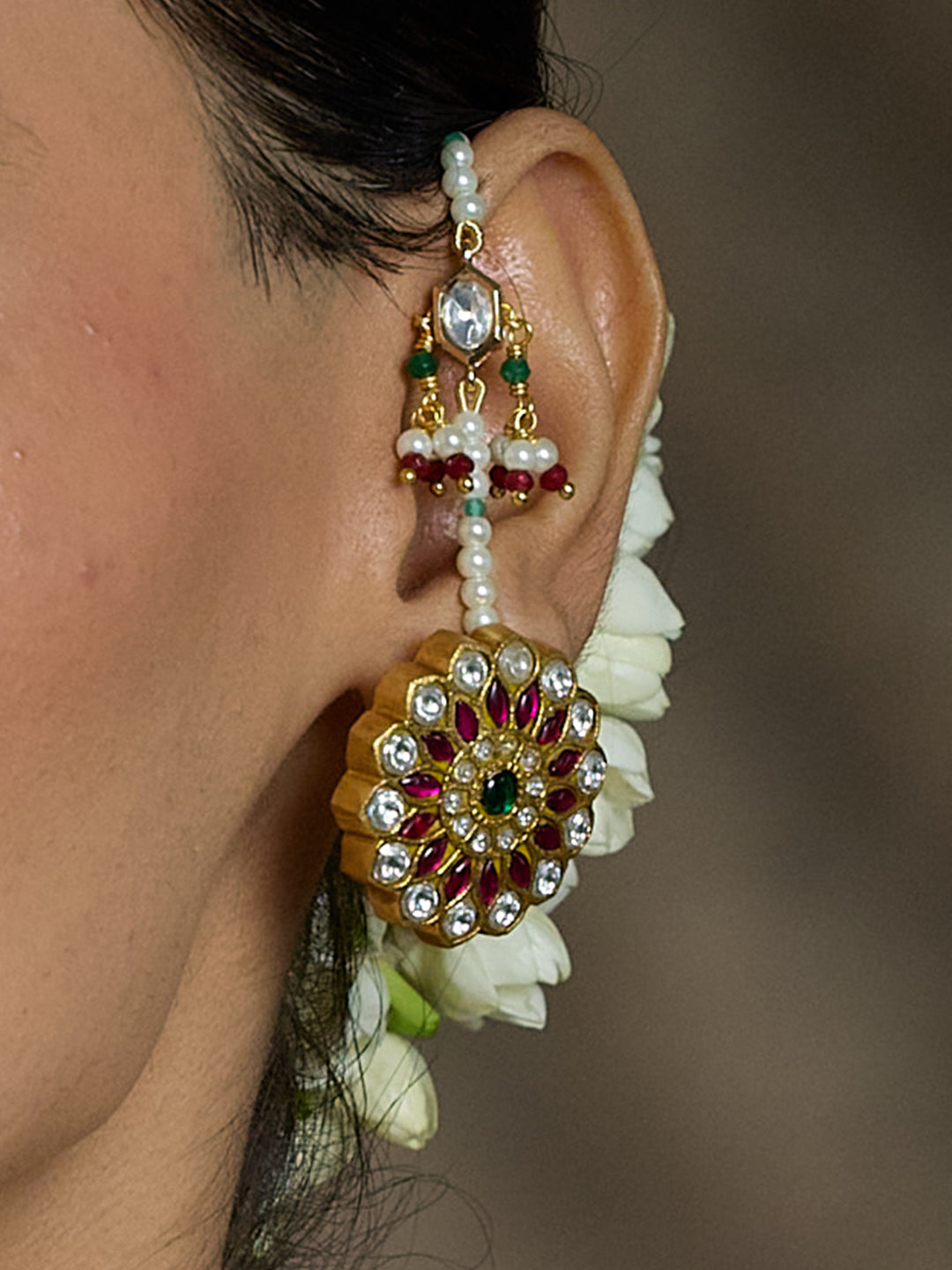 Elevate your bold look with these Antique Kundan Pearl Hoop Earrings. With radiant Kundan and delicate pearls, they offer a perfect blend of tradition and timeless elegance.