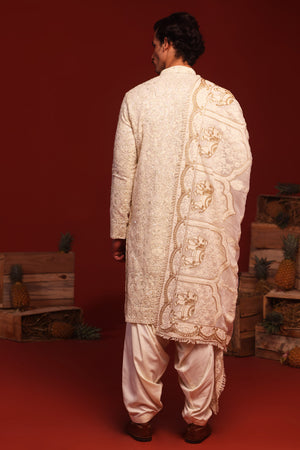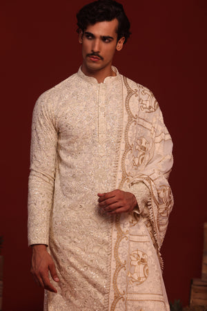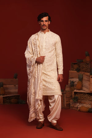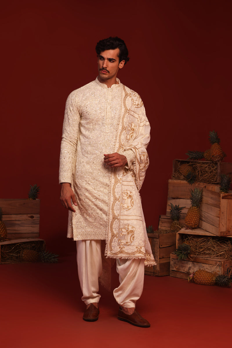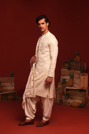 This stunning kurta set features exquisite reshom and sequined embroidery, adding a touch of opulence to your wardrobe. The kurta is designed with intricate embroidery work and includes two functional pockets for added convenience. It is fully lined with pure viscose for a comfortable fit.