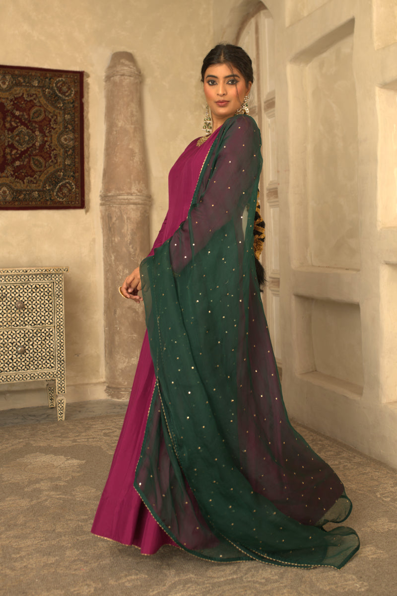 Elegant anarkali set tailored in upada silk fabric, highlighted with intricate embroidery focusing on the neck , enhanced by delicate handwork pared with organza dupatta with hand cheetha work, perfect for festive elegance.