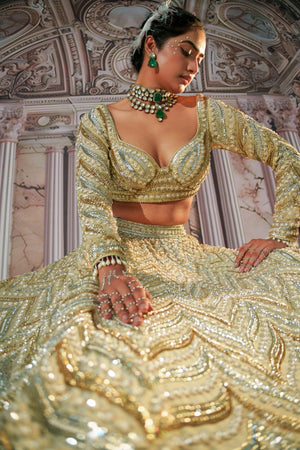 This Gorgeous Golden Lehenga In Organza Have Beautiful Embroidery On It .Beads And Sequins Have Well Defined The Design Of Paan Shape .The Blouse Is Fully Embroidered.The Lehenga Has Finished With The Dupatta .