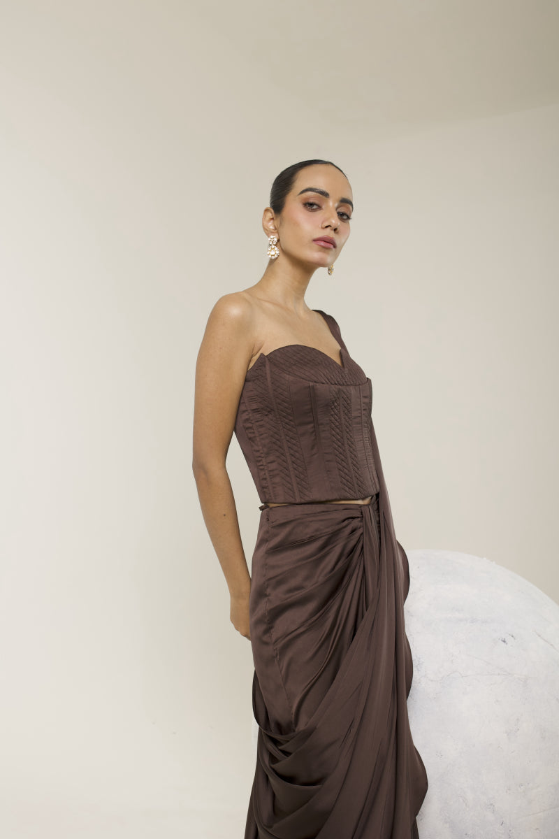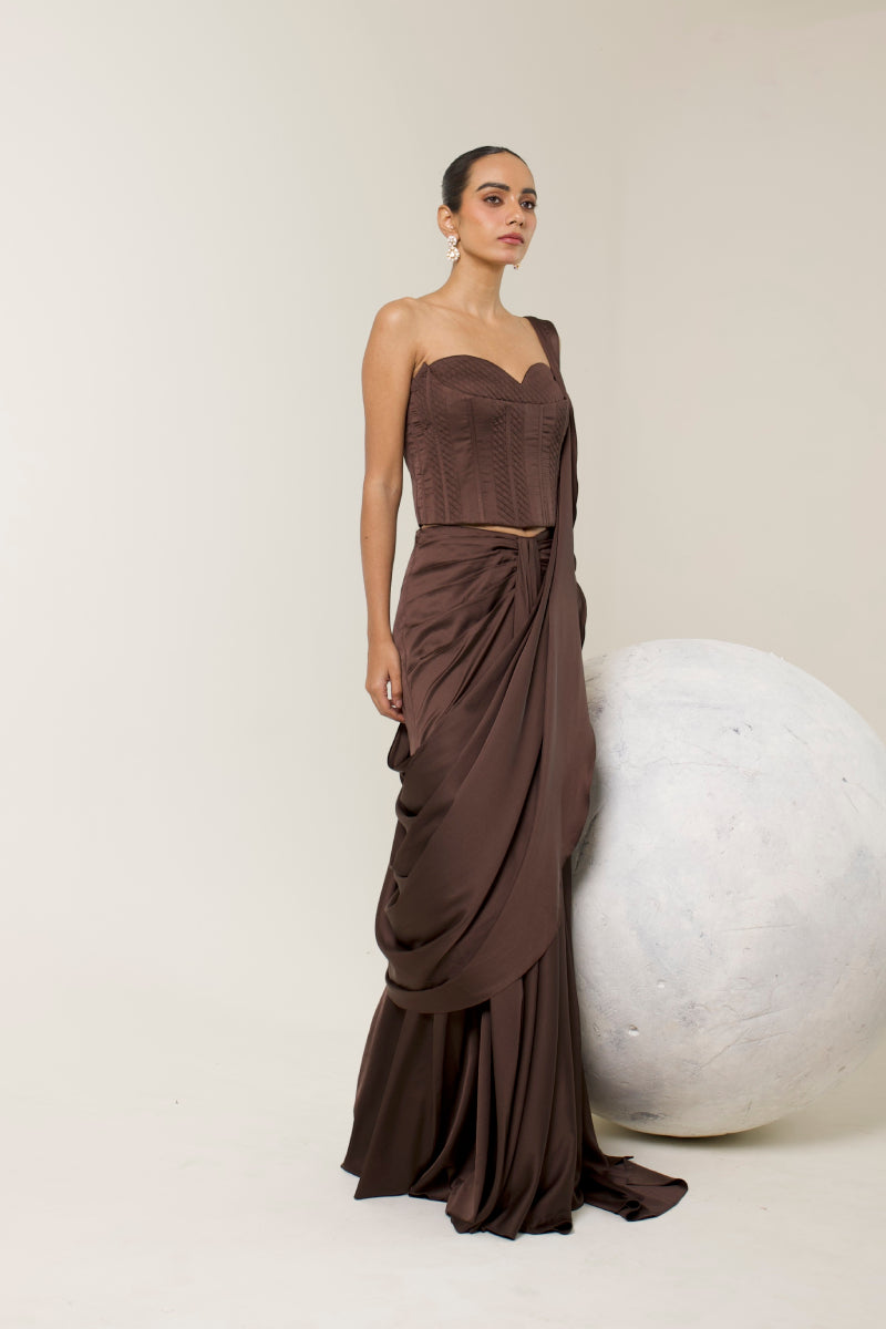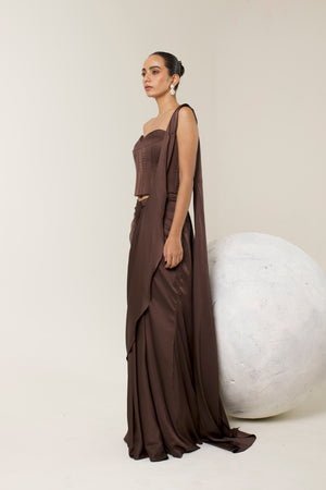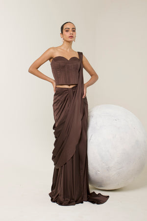 Command the spotlight in our Chocolate brown Corset Saree — a sculpted silhouette that marries structure with fluidity. Designed in luxurious fabric, the corset contours the body with precision, while the pre-draped saree cascades effortlessly for a modern, yet timeless appeal. With refined gathers and a cinched waistline, this ensemble is your go-to for elevated celebrations and unforgettable entrances.