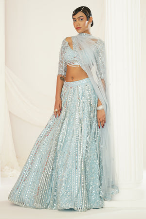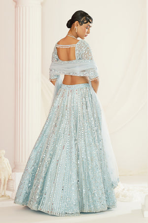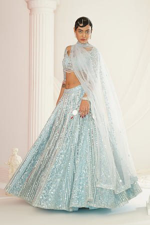Aqua Blue Embellished Choli, Lehenga And Dupatta Set