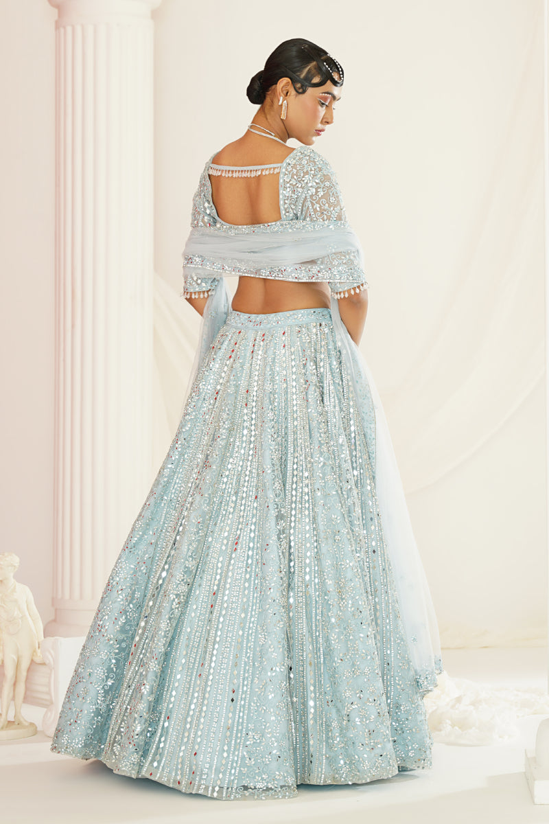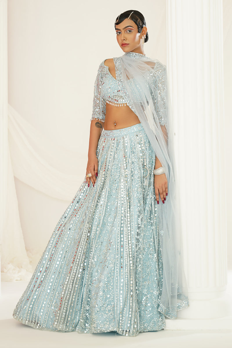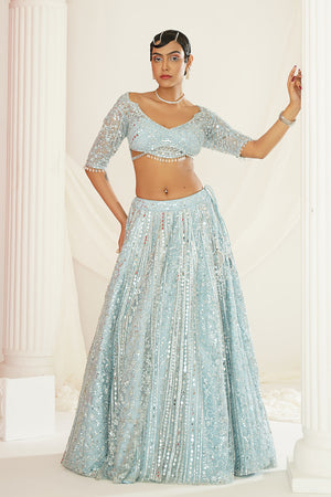 Kapda Dori's stunning Aqua blue net fabric lehenga and blouse, the lehenga is beautifully adorned with intricate dori, crystal, stone, and mirror embroidery. This piece adds a touch of glamour and sophistication to your look. It is styled with net embellished blouse adorned with intricate dori, crystal, stone and mirror embroidery with crystal tessels on waist along with complimenting net dupatta to complete the look.