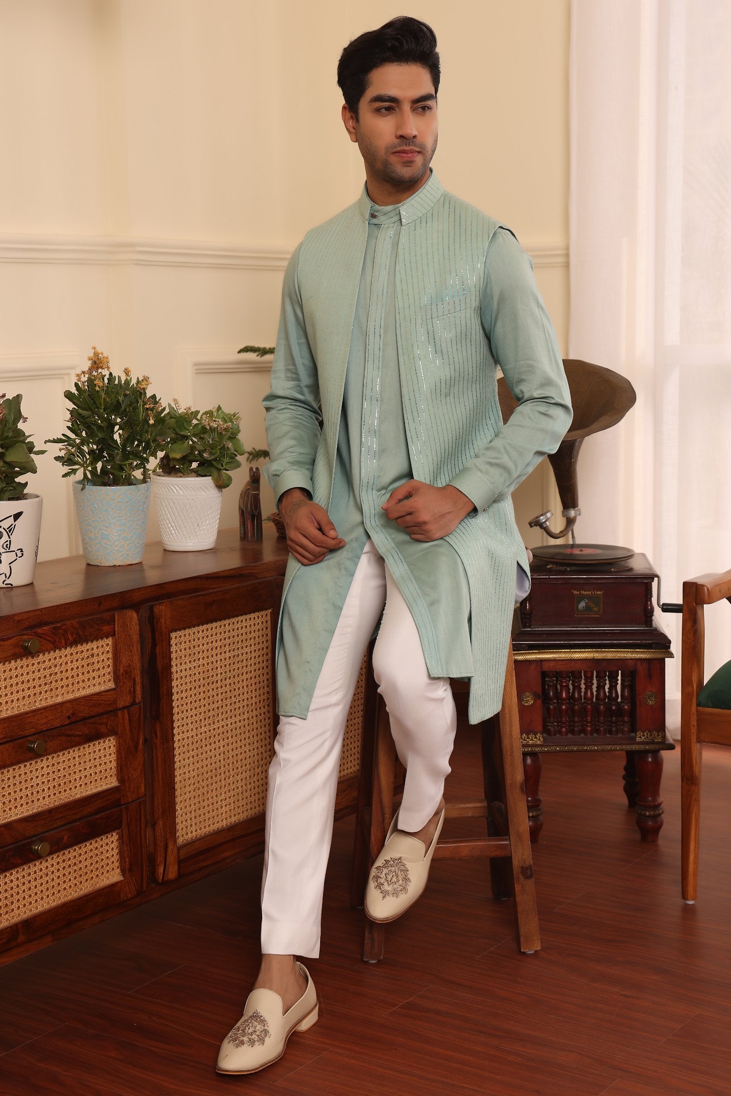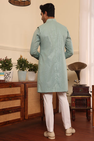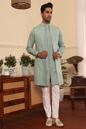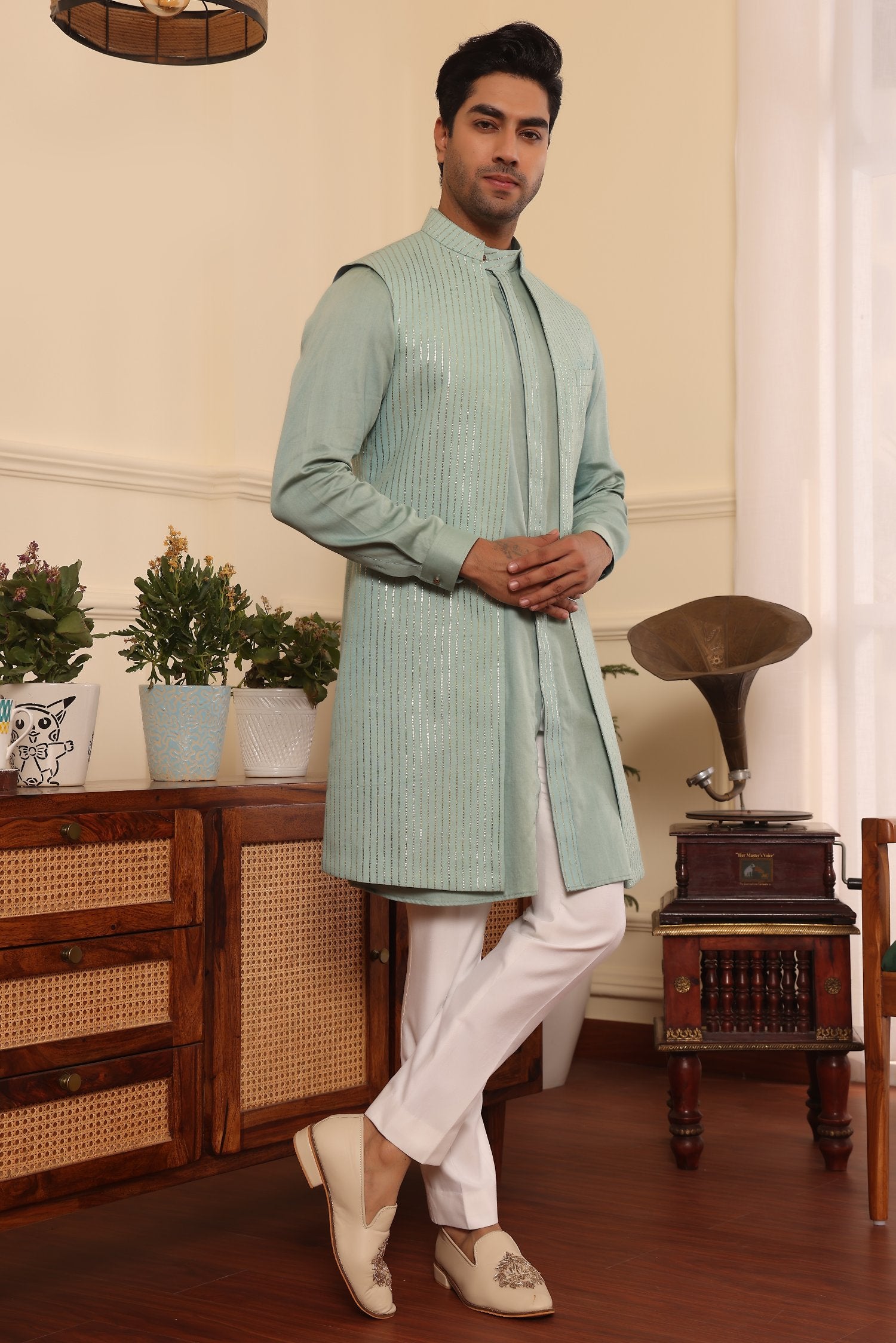 Make a splash in fashion with our Aqua Green Kurta Pants and Shrug Jacket combination. Effortless style meets vibrant elegance for a head-turning ensemble.