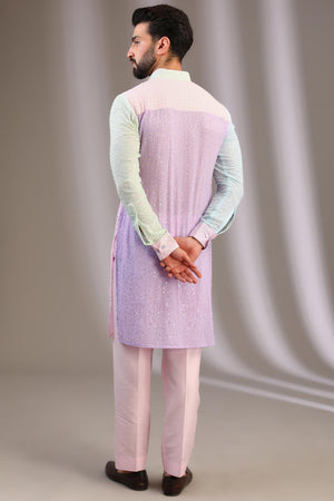 AQUA/GREEN/PINK 3 COLOR GORGETTE FULLY EMBO. UNLINED KURTA W SEQUIN COLLAR, CUFF, PLACKET W PINK COTTON SILK PANT