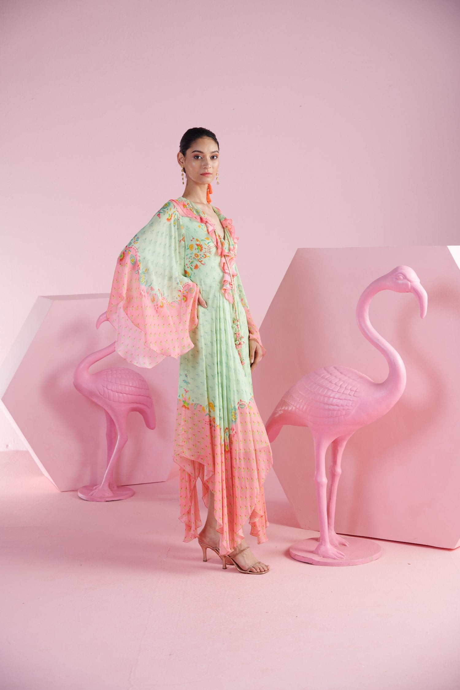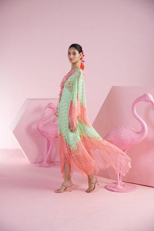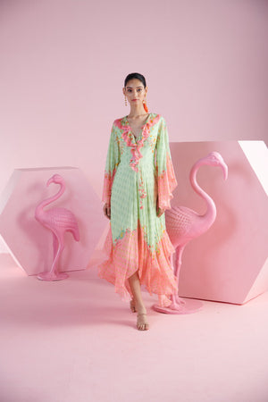 Step into fresh elegance with our Mint Blossom Asymmetrical Dress, featuring a light green hue accented with a delicate pink border. The dress showcases a flattering V-neckline adorned with soft ruffles, adding a touch of romantic charm. The asymmetrical hemline gives the dress a modern edge, while the ruffled neck detail brings a playful, feminine touch. Perfect for daytime events or a graceful evening out, this dress combines classic style with contemporary flair, making it a versatile addition to your wardrobe.