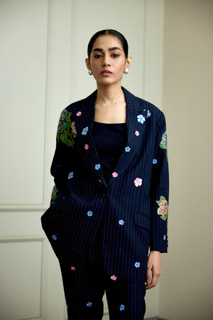 Crafted from premium Italian Suiting fabric, the Arden Blazer Set features a refined navy blue hue beautifully accented with hand-painted floral details. This elegant ensemble combines timeless tailoring with artistic touches, perfect for making a polished yet distinctive statement.