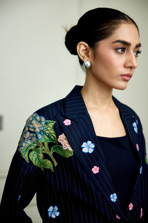 The Arden Blazer is tailored from luxurious Italian suiting fabric in a sophisticated navy blue, enhanced by delicate hand-painted floral accents. This piece melds classic craftsmanship with artistic flair, offering a refined way to stand out with elegance.