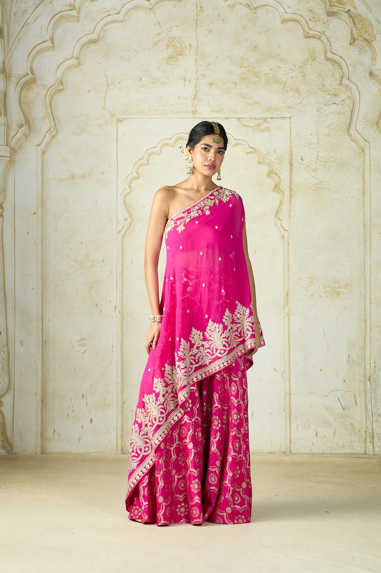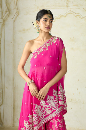Featureing a contemporary one-shoulder draped silhouette adorned with intricate embroidery and delicate motifs, blending modern style with traditional artistry. The flowing drape is paired with wide-legged palazzo pants showcasing elaborate patterns, adding richness and depth to the outfit.