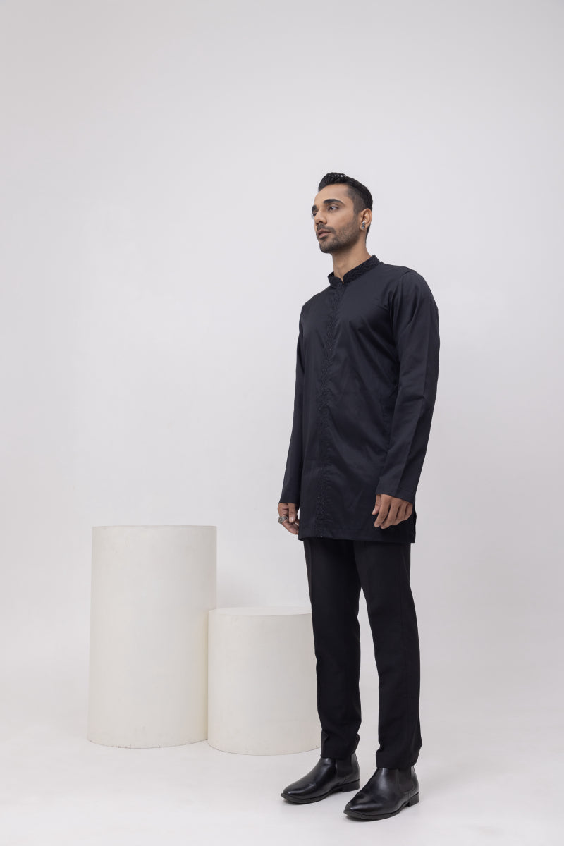 A Classic pintuck black kurta with detailing in front, you cant go wrong with when you want to make a statement! comfort like shirt , looks like kurta! best of boh world!