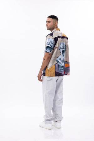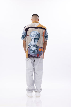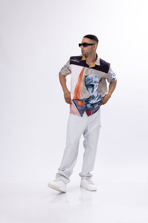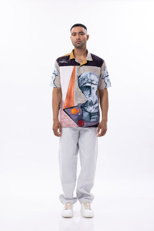 Multi color-Cotton Poplin-Relaxed fit-Digital Printed Shirt. This unique cotton transforms into a canvas of abstract marvels, breathing life into marble statues and forgotten artifacts. Each thread tells a tale of timeless artistry, where history meets innovation in wearable abstraction.