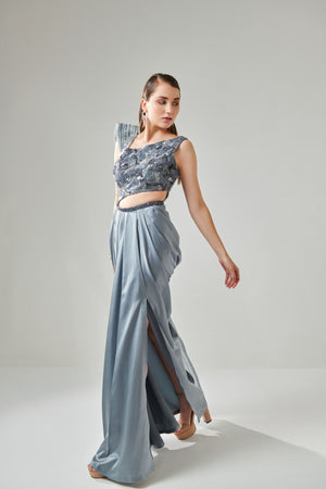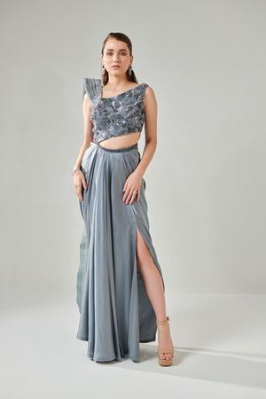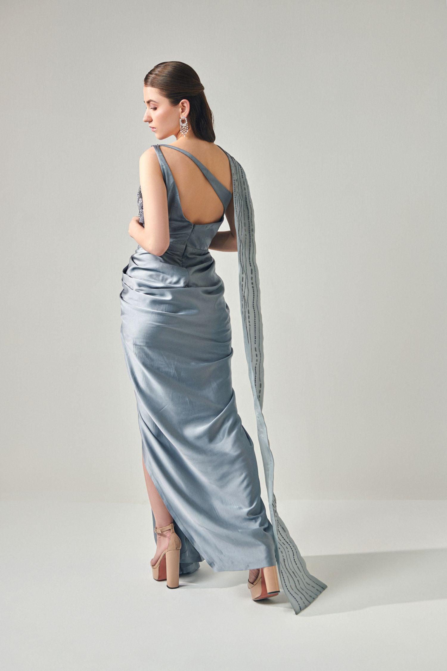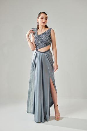 Ash Grey Drape Saree Gown With Embellished 3-D Palla