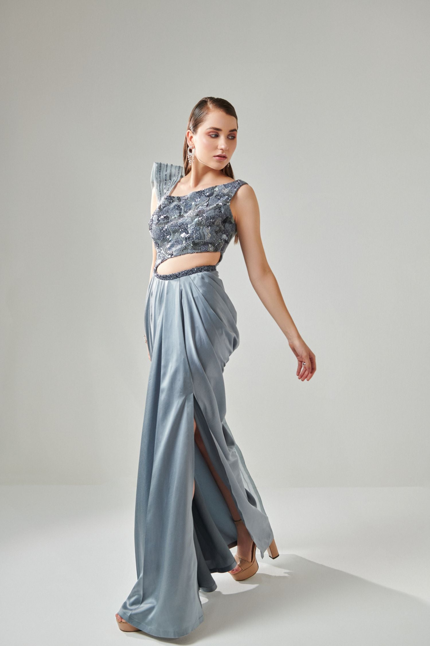 Ash Grey Hand Embellished Saree Gown With 3D Palla Featuring Cut Out At Waist And A Slit, Hand Embroidered In Hues If Grey And Charcoal With Beads, Sequences And Katdana Work . Featuring Cut Out Detail At Back