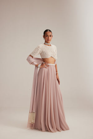 Ash Pink Skirt Paired with mirror and pearl embroidered High Neck blouse and Stole With Cascading Pearl Tassels.