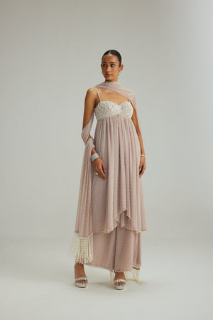 Ash pink mirror and pearl embroidered kurta paired with georgette pants and dupatta set.