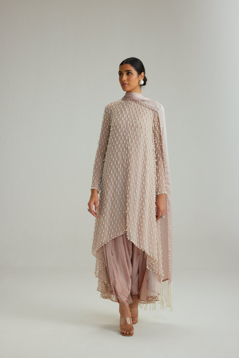 Ash Pink Pearl Drop Kurta set with paired with dhoti pants and Dupatta.