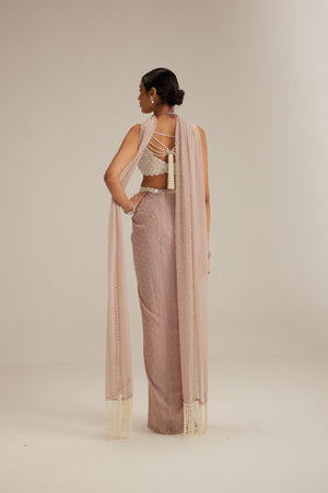 Ash pink Pearl Scattered draped skirt set paired with a heavily mirror and pearl embroidered blouse and dupatta.