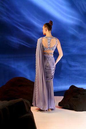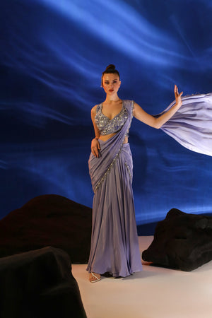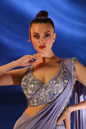 A deep V neck wrap around blouse paired with a full flare pleated drape saree is the perfect ensemble to make a statement. The Asherah drape is a heather purple hued saree that is as graceful as it is exclusive.