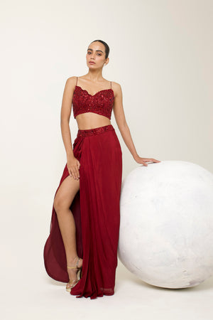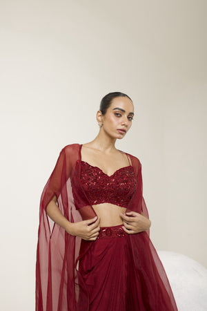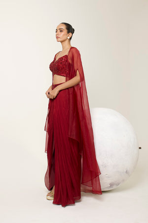 A bold blend of tradition and modernity — this Maroon cape dhoti set features an embroidered blouse and a statement cape. Effortlessly chic, perfect for festive moments.