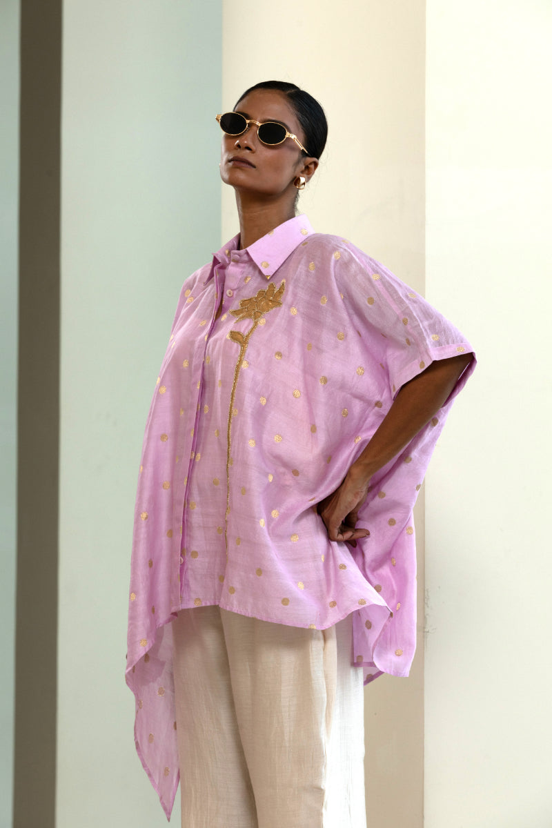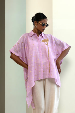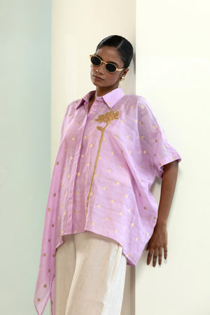 Elevate your everyday wardrobe with our Asymmetrical Chanderi Shirt, a modern take on effortless luxury. Crafted from pure zari booti chanderi this flowy and breathable piece drapes beautifully, offering a relaxed yet polished look.