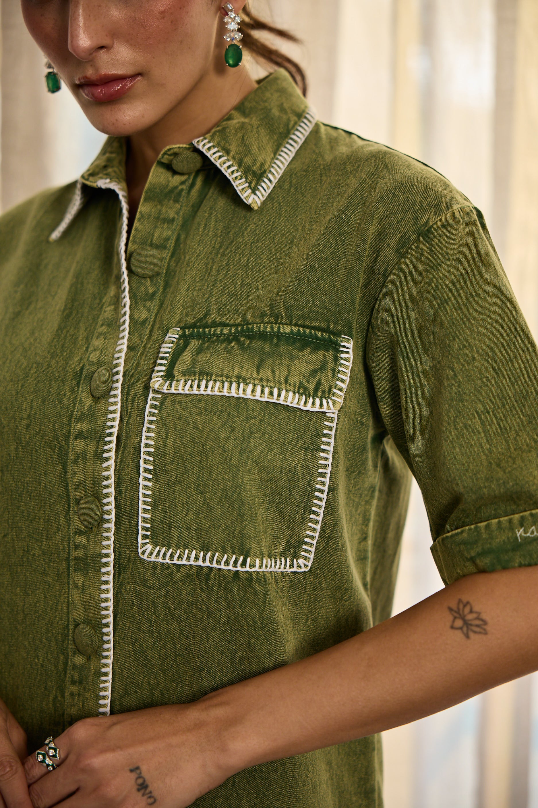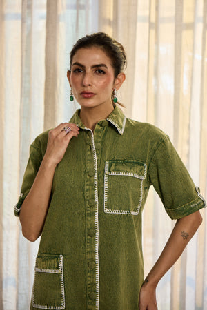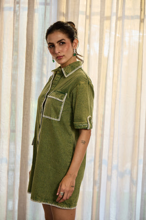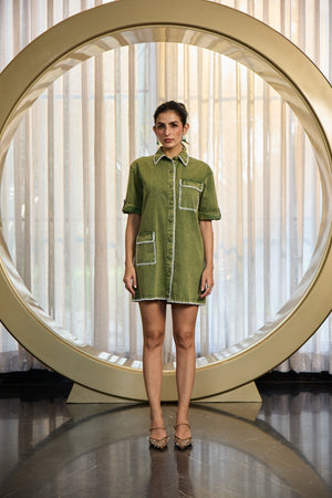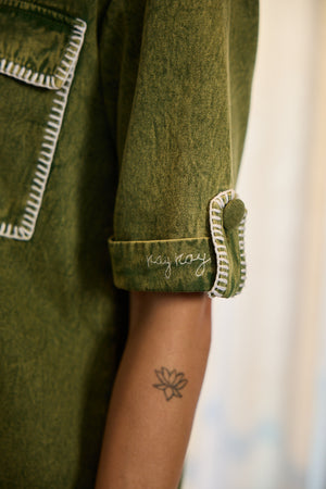 A statement in subtlety, this olive denim dress redefines casual polish with contrast stitching and oversized pockets. Clean, confident, and distinctly Kay Kay.