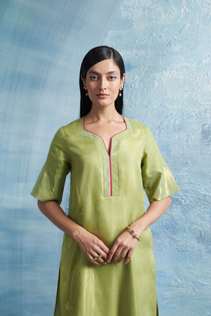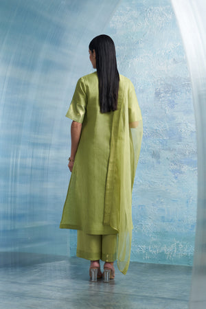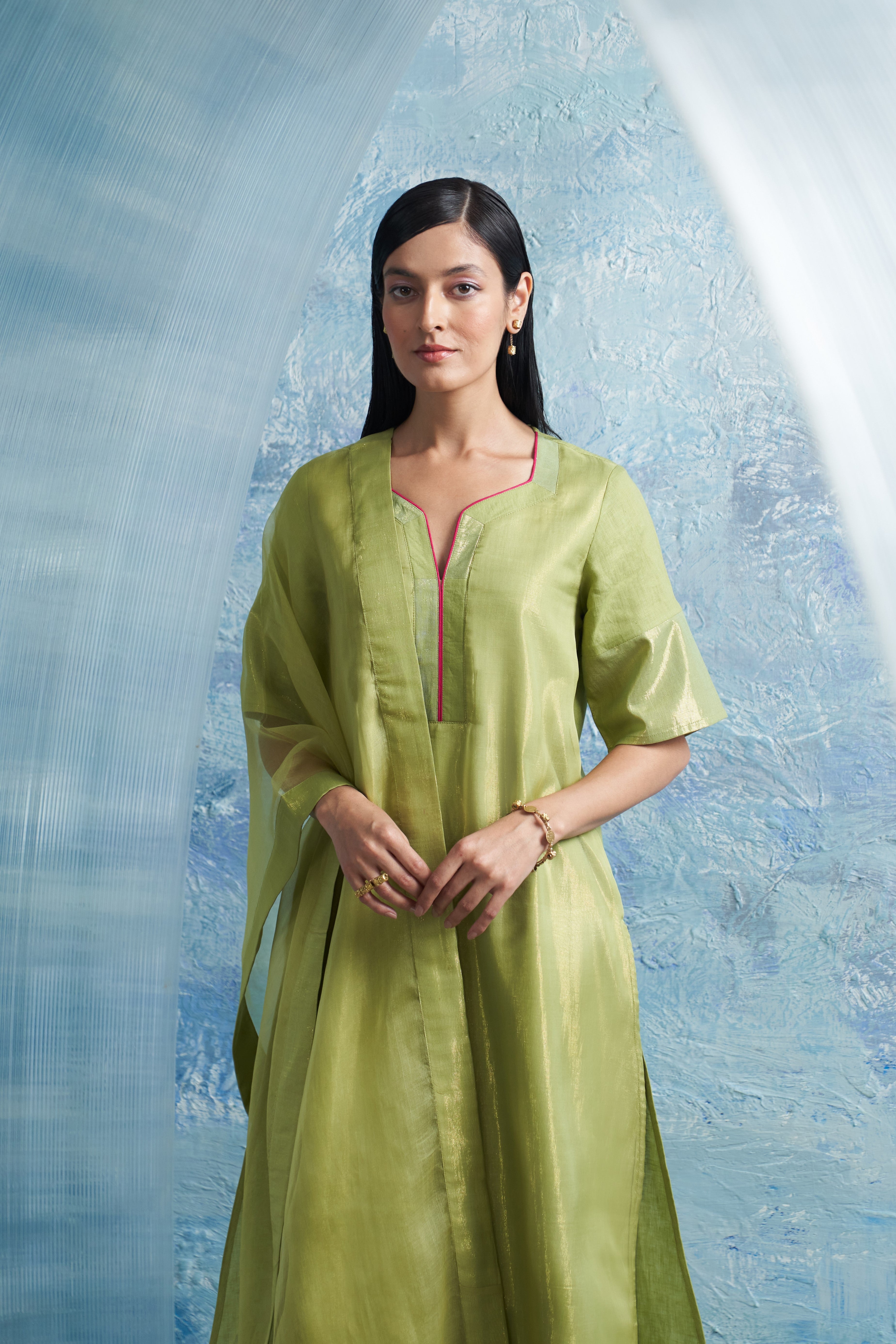 Featuring an edgy and chic neckline with a captivating interplay of contrast detailing, our A-Line kurta is an absolute must-have for your wardrobe. Paired with flowy cotton satin pants and a sheer organza dupatta, it completes the ensemble with sophistication and grace. Its contemporary design adds a touch of flair to any outfit, making it a versatile piece for both casual and formal occasions. Elevate your style effortlessly with this statement piece.