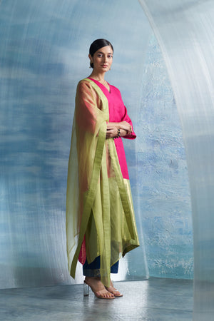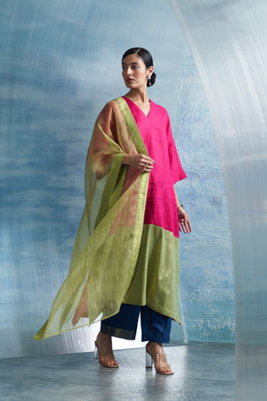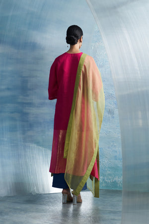Enter elegance with our fuchsia pink kurta set, crafted from premium linen and cotton shimmer fabric. Its timeless silhouette flows gracefully, exuding chic charm. The blend of linen and shimmer creates a mesmerizing allure that catches the eye. Paired with flowy cotton satin pants, this set offers both comfort and style in equal measure. Complete with a sheer organza dupatta.