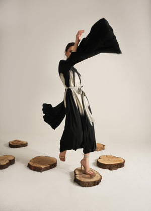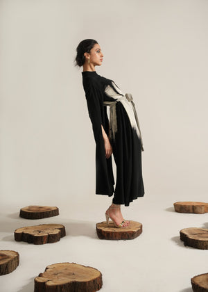 The flowy silhouette of aura dress drapes gracefully with a centre belt that creates a flattering waistline, complemented by contemporary extended sleeves, adding a touch of refinement to the ensemble. This dress promises a sleek and stylish look that's sure to catch the eye.