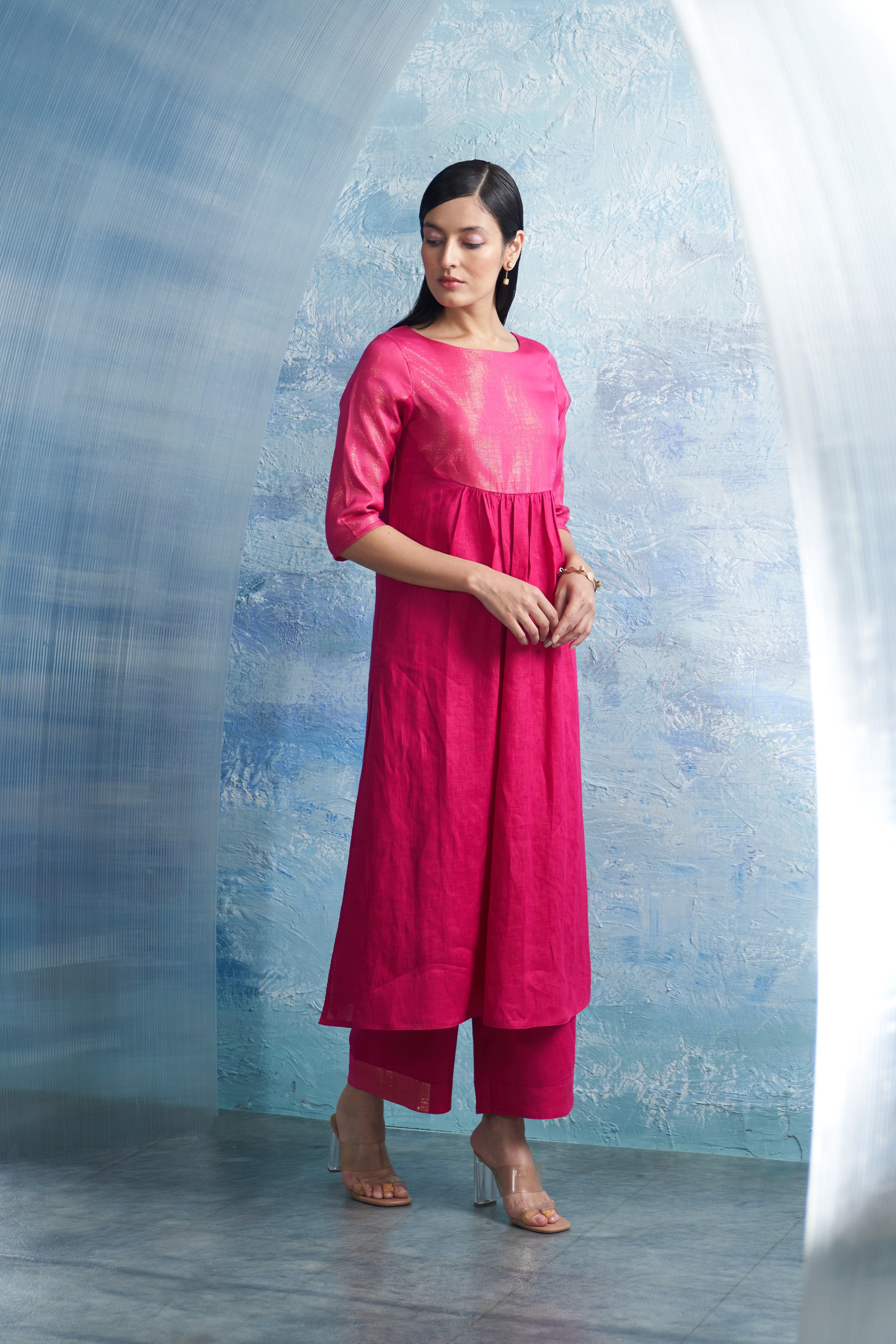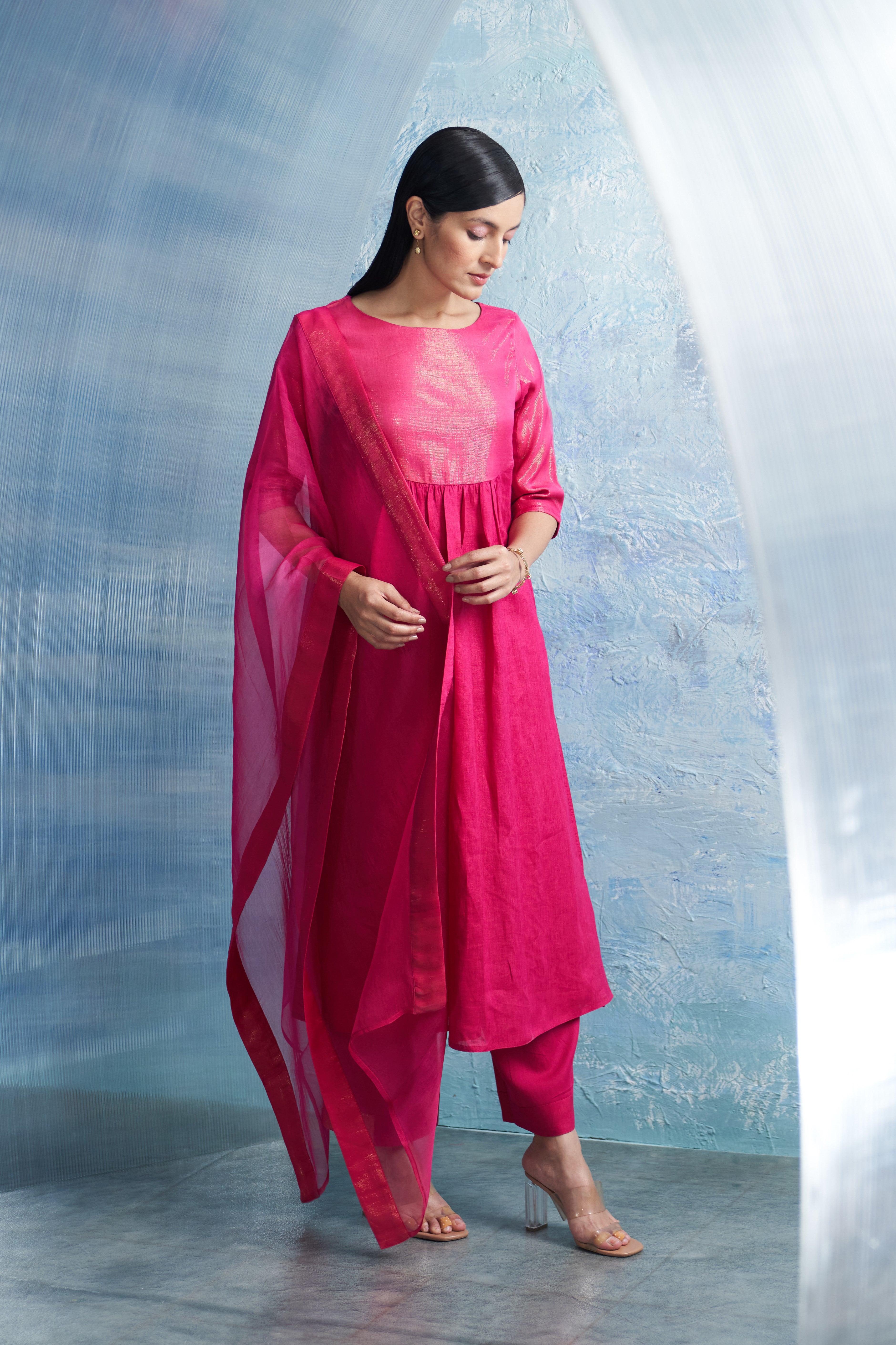 Step into the limelight with your aura in the excellence of a beautiful fuchsia pink kurta set, crafted from premium linen and cotton shimmer. The linen kurta features shimmer on the yoke and sleeves, exuding elegance. Paired with flowy cotton satin pants. Elevate the ensemble with a sheer organza dupatta, making it an ideal pick for any classy occasion.