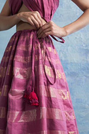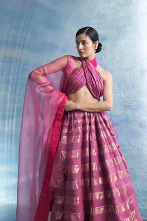 Our Grape Pink Lehenga Set, exquisitely crafted from luxurious linen fabric. This opulent ensemble is adorned with panels of graceful shimmer, adding a touch of glamour to its rich texture. Paired with a contemporary wrap linen blouse and a sheer organza dupatta, this lehenga set is the epitome of elegance and sophistication. Whether it's a grand event or an intimate gathering, this show-stopping ensemble is the perfect choice to make a statement and turn heads with your impeccable style.