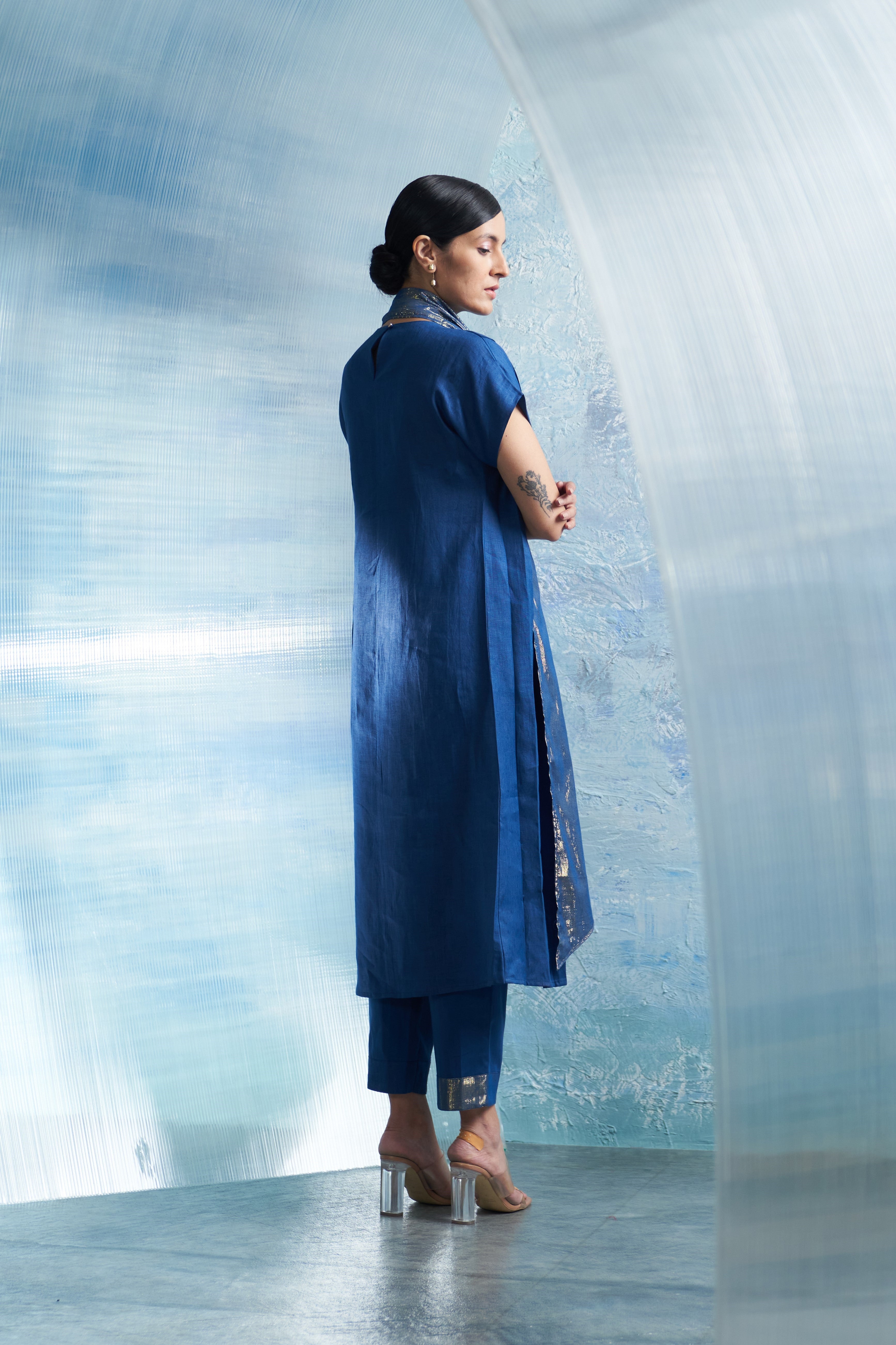 Step into sophistication with our Aura Neck Scarf Kurta, a masterpiece of contemporary elegance. In a regal royal blue hue, this ensemble seamlessly blends modern flair with timeless charm. Crafted from premium breathable linen fabric, it promises both comfort and style, making it a versatile choice for any occasion. The delicate shimmer embellishment adorning the neckline adds a touch of allure, catching the light with every movement for a captivating effect. Paired with shimmering pants, it's the perfect ensemble to elevate your look at any event or celebration.