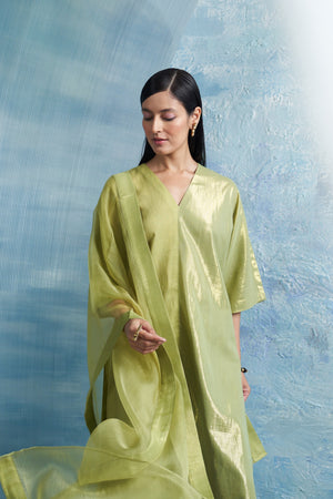 Step into elegance with our sheen green kurta set, meticulously crafted from the finest blend of premium linen and cotton shimmer. Its timeless silhouette flows gracefully, radiating chic charm. The subtle sheen of linen blends seamlessly with the refined shimmer, creating an enchanting interplay that captivates the eye. Paired with flowy cotton satin pants, this set offers both comfort and style in equal measure. Complete with a sheer organza dupatta.