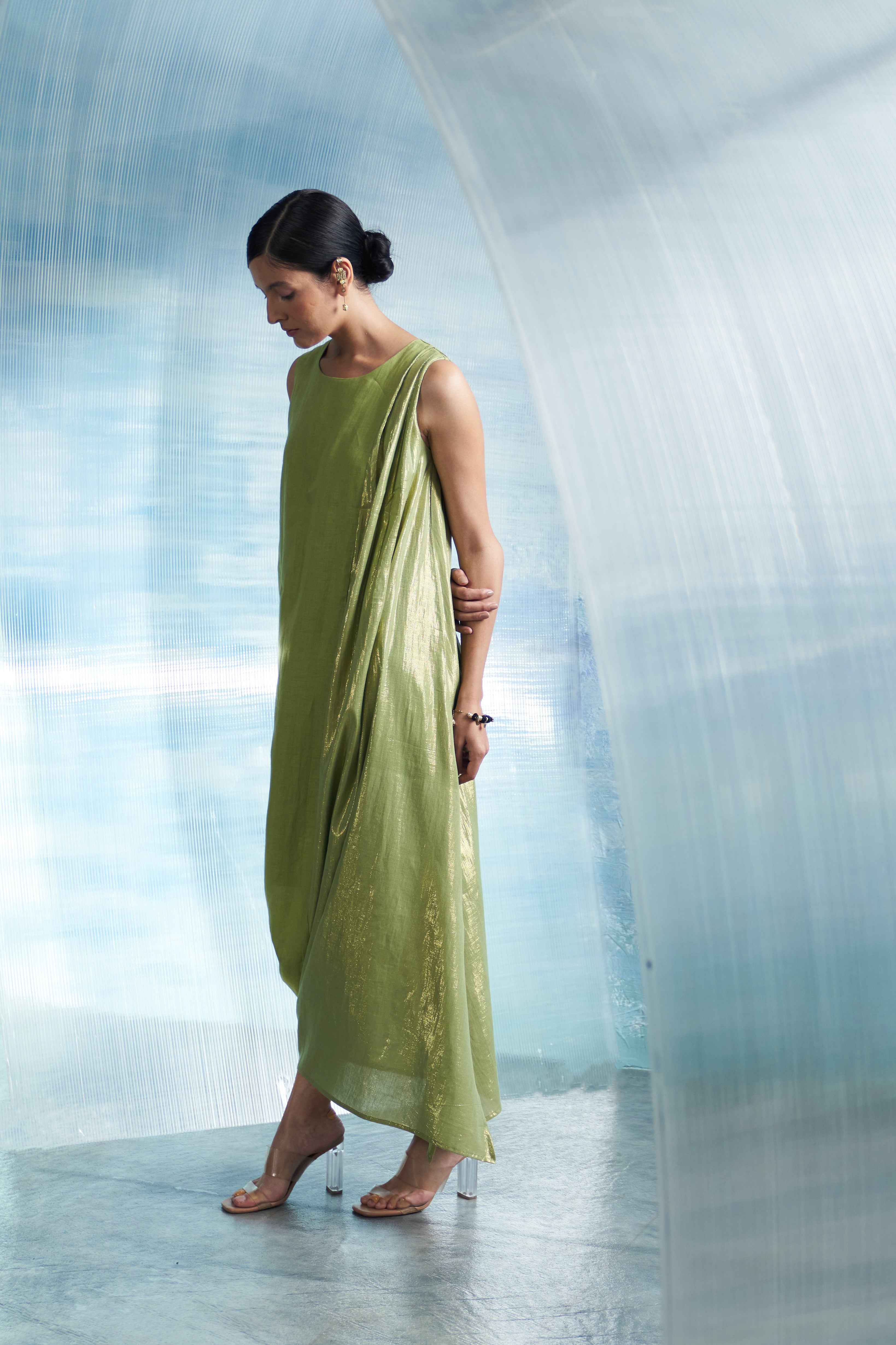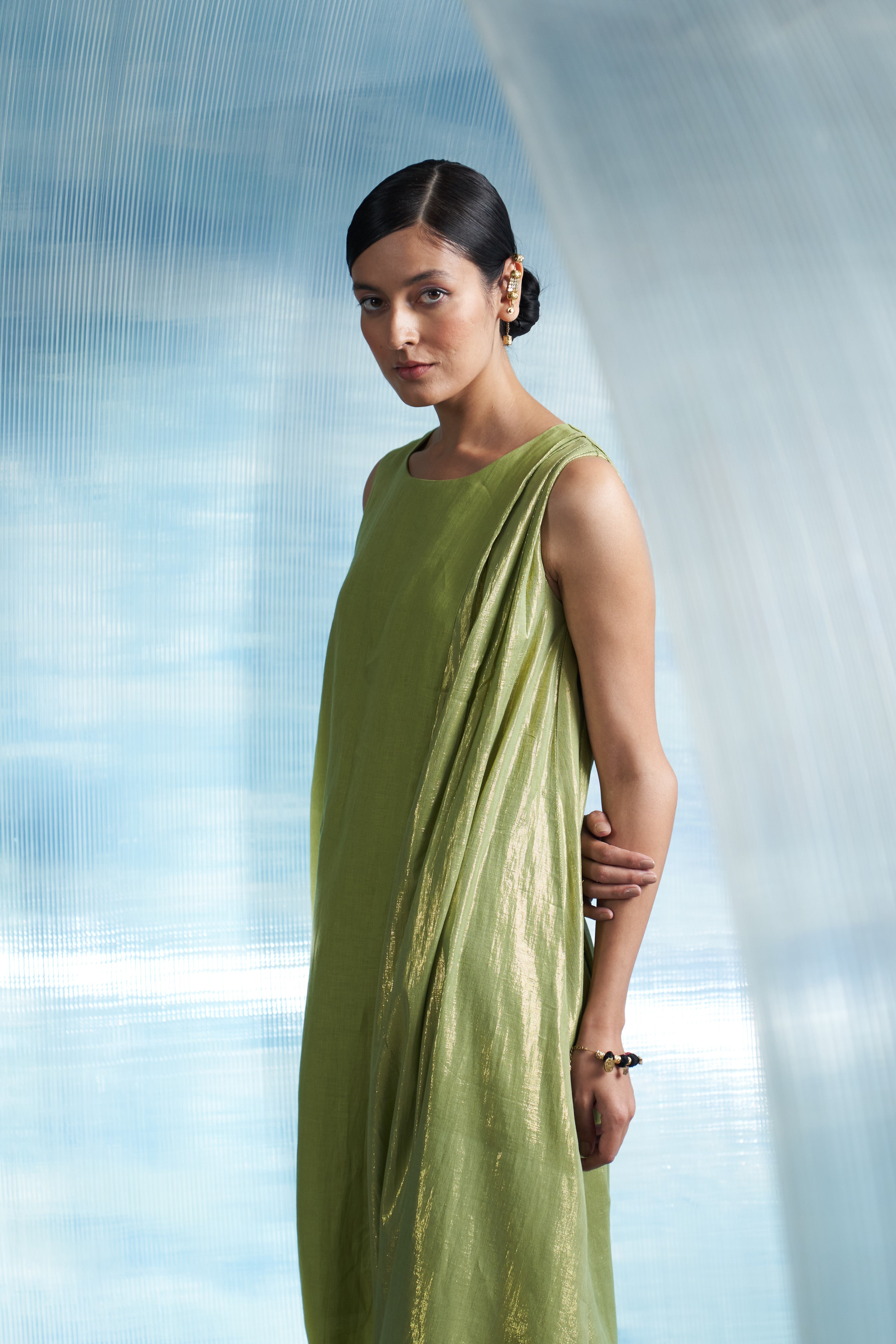 Lining Drape Style Dress, enveloped in a hue of luminous sheen green. Designed with a thoughtful inner lining, this dress exudes elegance from every angle. Elevating its allure is a stylish tie-up belt, cinching the waist and accentuating your silhouette for a flattering fit. Whether for a sophisticated soirée or a casual outing, this dress promises to enhance your beauty with its timeless charm and effortless grace.