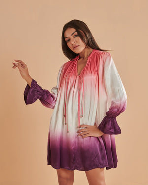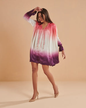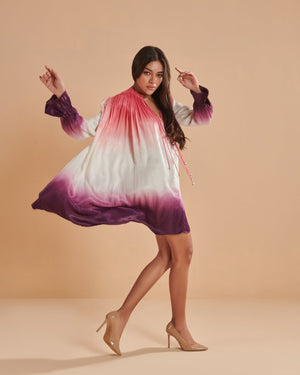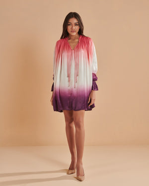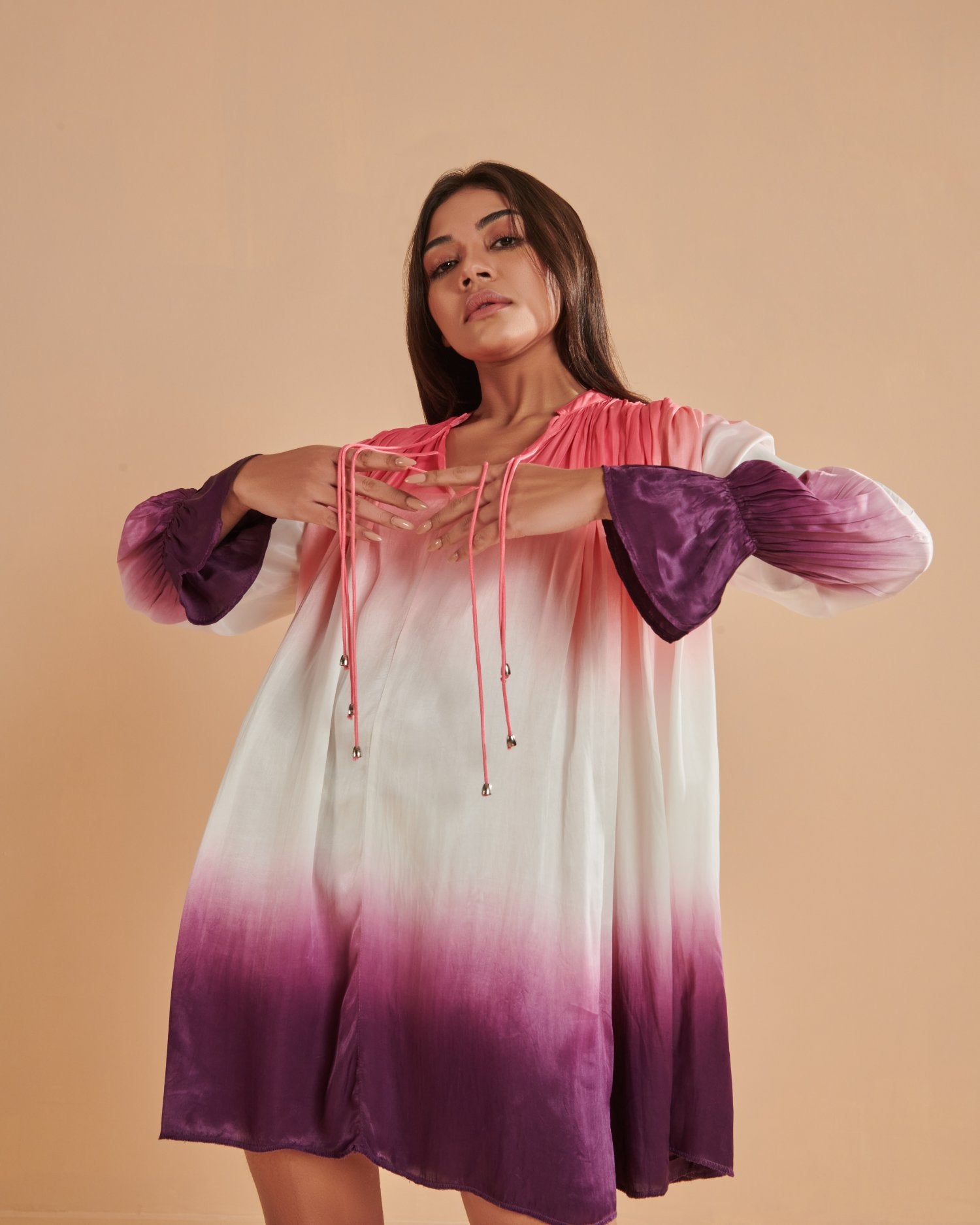 Aurelia dress is a contemporary shift dress. This boho masterpiece can be styled up or down. The tie and dye ombre details in the shades of pink and purple makes it a perfect tone-on-tone look.