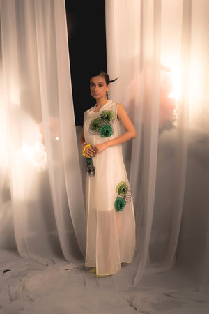 organza slits add fluidity, while the modal satin