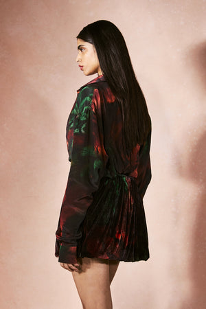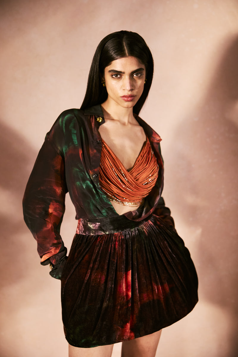 A bold co-ord that sparks instant impact. A flame-print shirt layered over a corded bralette with subtle embroidery, paired with a velvet bubble skirt. Striking, sensual, and unapologetically glam, crafted for cocktail nights, and transformative moments.